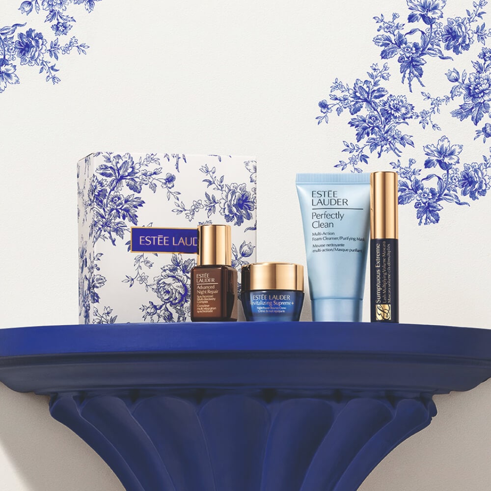 Dieses Blockbuster-Set 2025 enthält: Advanced Night Repair Serum und Eye Gel-Crème, Revitalizing Supreme+ Moisturizer, 2 Lippenstifte, Re-Nutriv Handcreme und mehr — alles in einem exklusiven Beauty-Train-Case.